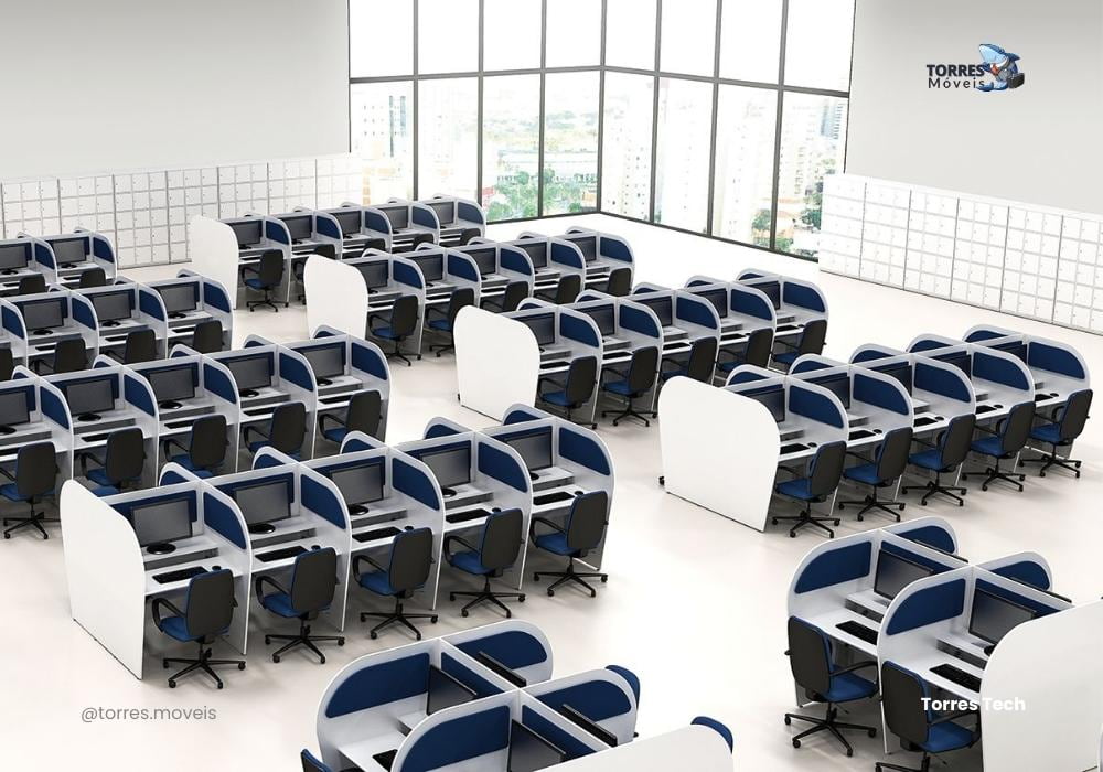 Torres Tech: estações de trabalho ergonômicas NR-17, ajuste de altura, gestão de cabos e abafadores acústicos. Ideal para call centers e ambientes produtivos.